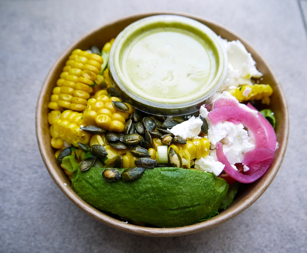 grilled fresh sweetcorn, quinoa, guacamole, pickled red onion, tomato, coriander.