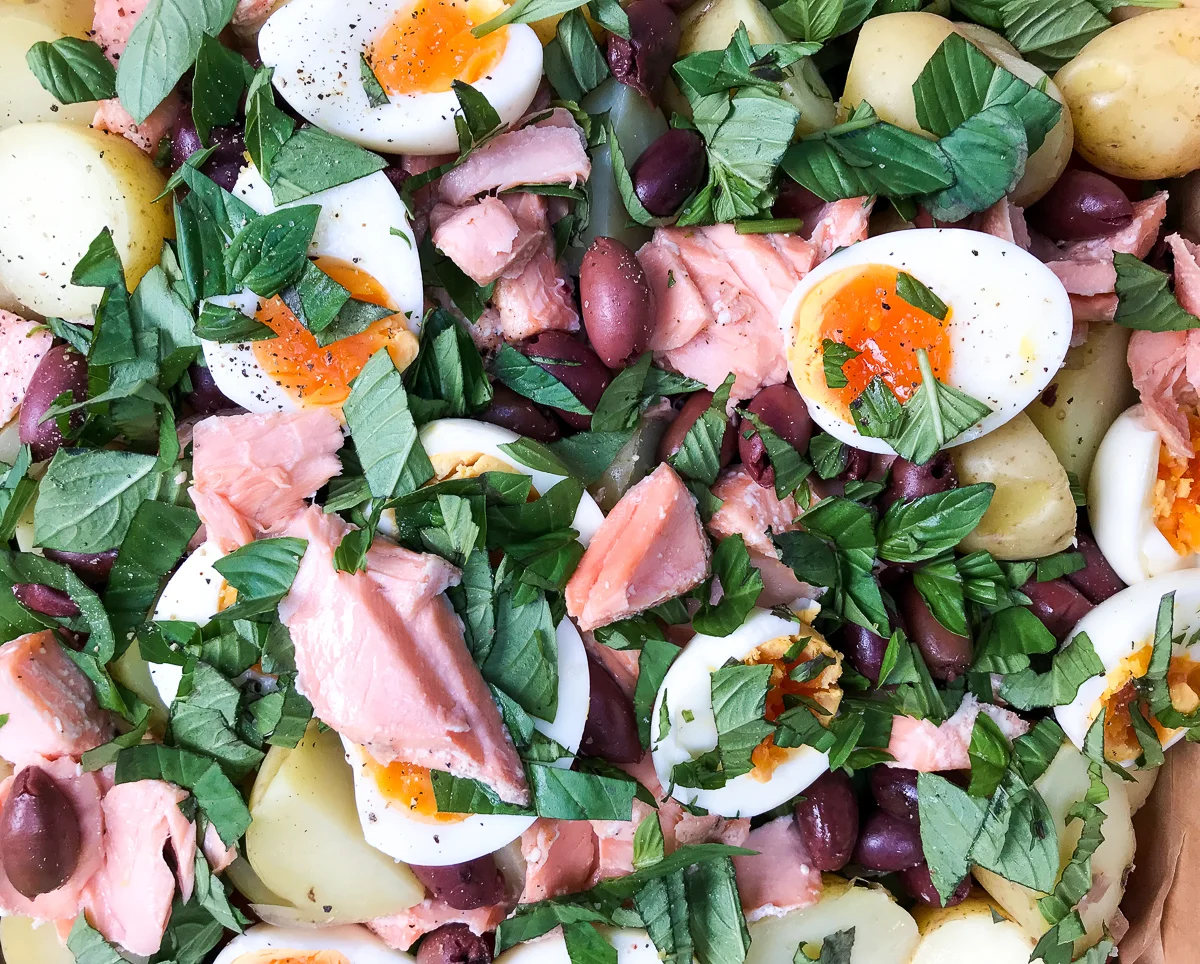 roast salmon, black olive, basil, green bean, jammy egg, butter lettuce.